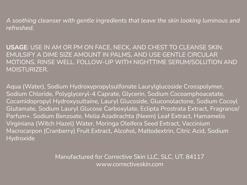 Use in AM or PM on face, neck, and chest to cleanse skin.