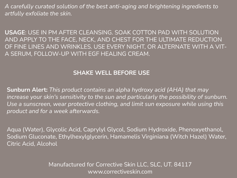 The Brightening Solution is designed to provide both intense exfoliation and balanced hydration. By combining 4% glycolic acid with citric acid, it works to remove dead skin cells, smooth texture, and brighten overall skin tone. Witch hazel’s astringent and anti-inflammatory properties refine pores and control oil, making this solution versatile for refining, brightening, and calming skin. Its balanced pH ensures optimal efficacy without excessive irritation.