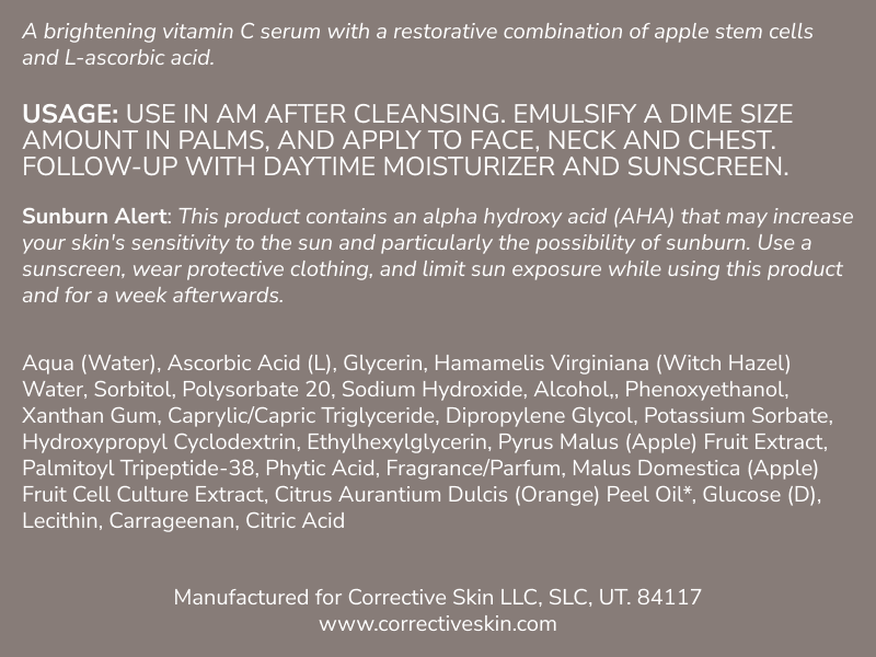 The Vitamin C Repair Serum combines high-potency L-ascorbic acid with apple stem cells and peptides to provide comprehensive skin rejuvenation. The formula penetrates deeply, targeting pigmentation and fine lines while boosting collagen and elastin synthesis. This serum enhances skin texture and elasticity, leaving a smooth, radiant finish while providing essential protection against environmental stressors. The addition of phytic and citric acids ensures gentle exfoliation, refining skin tone and allowing the Vitamin C to perform at its peak.